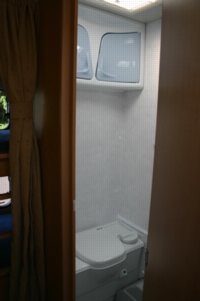●色遣いがとてもいい雰囲気のトイレルーム兼用シャワールーム。フォーセットはシャワースルータイプなので、引き抜いて使用する事ができます。カセットトイレはキャンピングカーの必需品です。出かける場所を選びません。 |
